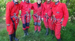 Nous reprenons les activités souterraines en allant faire la traversée de la rivière souterraine de Bramabiau. Nous nous équipons sous un temps froid et pluvieux. Cette rivière peut être suivie sous terre d’un bout à l’autre, de la perte jusqu’à la résurgence, dans des galeries monumentales. Le temps est à l’orage, il fait froid ce matin. Nous nous engageons dans le beau tunnel côté amont. Les eaux sont très basses mais par contre bien fraîches. La descente se fait tantôt à la nage, tantôt en opposition dans ce canyon souterrain. La partie aval est aménagée pour le tourisme et la fin du parcours se fait sous les projecteurs. La traversée a duré un peu plus d’une heure et nous ressortons en retrouvant le beau temps revenu. Nous terminons la journée en allant admirer le panorama au sommet du mont Aigoual, point culminant de la région. La vue s’étend sur les causses, les Cévennes et la mer Méditerranée scintille au loin.